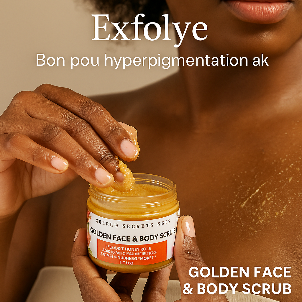 GOLDEN SCRUB Turmeric and kojic acid are commonly used in skincare products for their beneficial properties. TThis scrub containing ingredients that will help to exfoliate the skin, brighten the complexion, and even out skin tone. Here's a quick overview of their benefits: