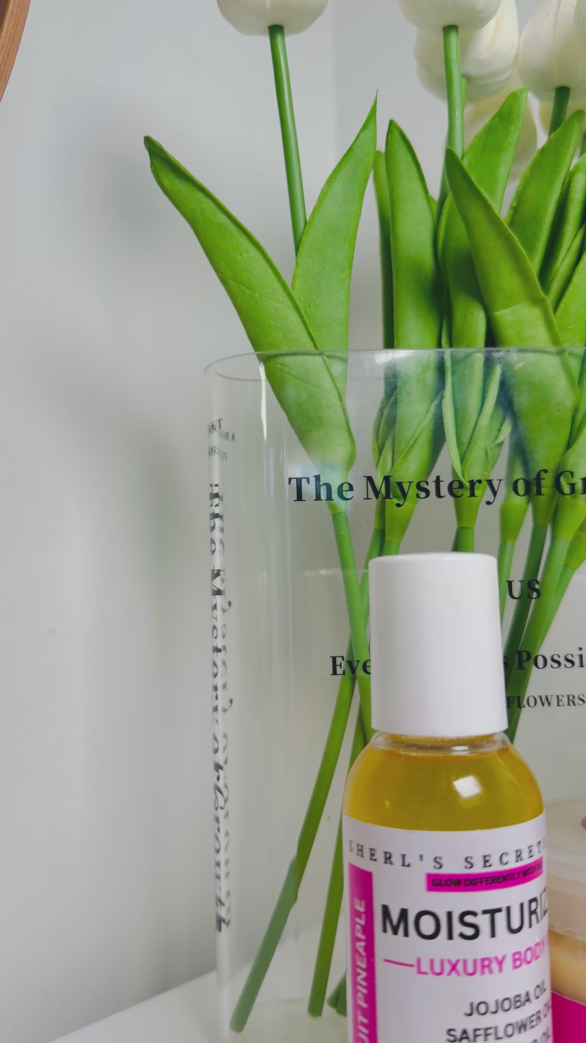 - Once the body butter has settled, take a small amount of body oil, just enough to cover the areas you've moisturized.